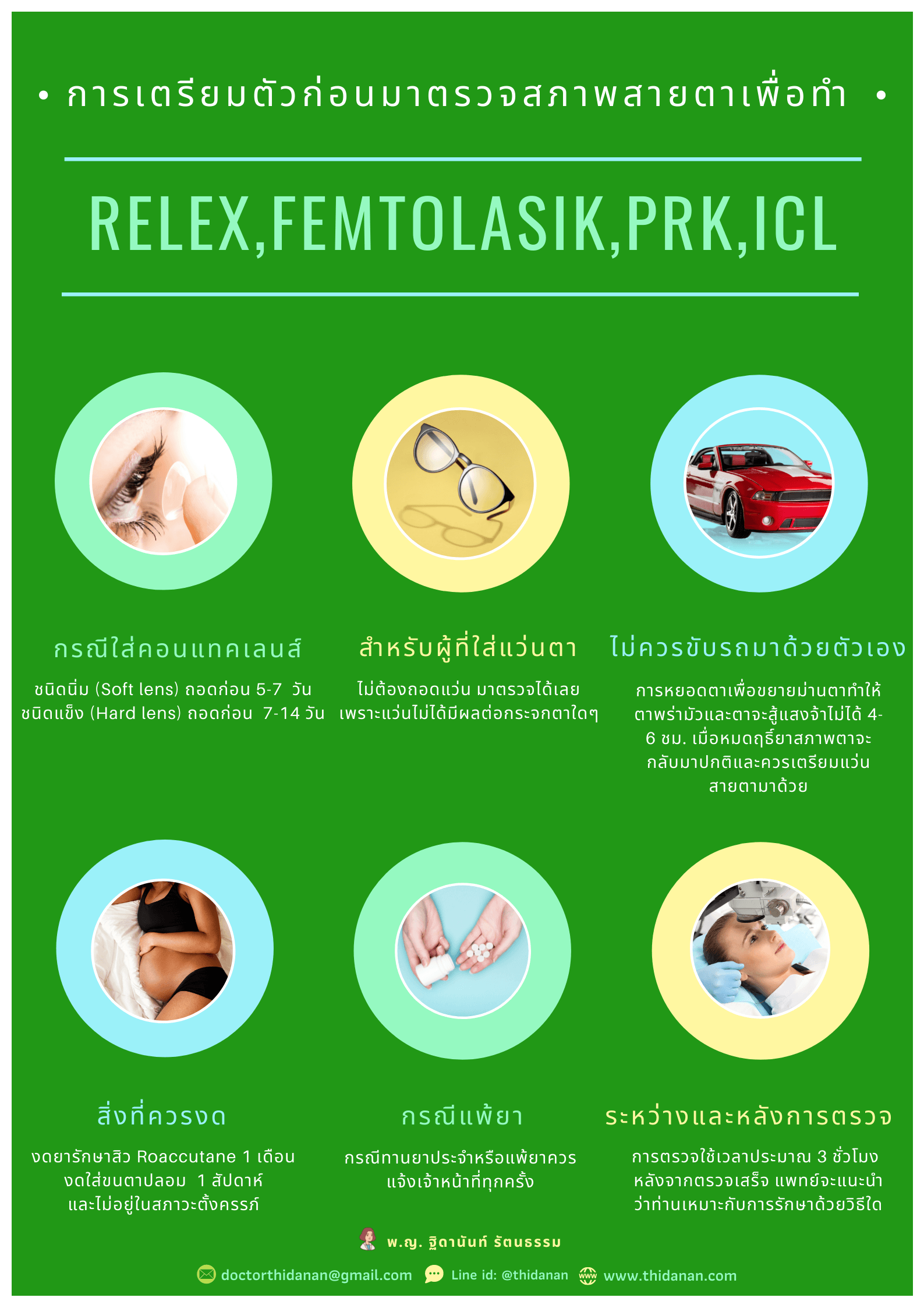 - จุดประสงค์ของการตรวจ เพื่อประเมินสภาพสายตาว่าท่านเป็นบุคคลที่มีสภาพตาที่ปกติ และสามารถแก้ไขสายตาสั้น ยาว เอียง ด้วยเลเซอร์หรือเลนส์เสริมได้ด้วยความปลอดภัย ประกอบด้วยการวัดค่าสายตา วัดค่าแว่นเดิม วัดความดันลูกตา ถ่ายภาพประเมินสภาพกระจกตา ตรวจจอประสาทตา และ การตรวจอื่นๆที่แพทย์เห็นว่ามีความจำเป็น